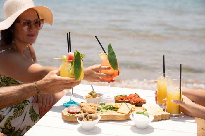 Beach service directly at your umbrella with aperitifs, snacks, and refreshing drinks. Beach bar offering artisanal breakfasts, quick lunches, sunset aperitifs, dinners, and moonlit barbecues.
